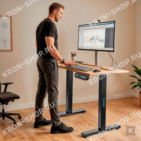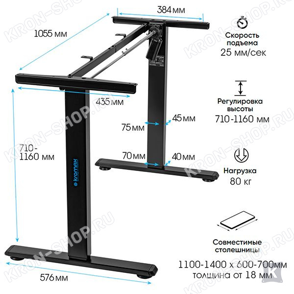 Рама с микролифтом для подъема столешницы Kromax модель OMEGA-40 на 2-х опорах идеально подходит для производства столов типа сидя стоя с электрической регулировкой по высоте. Конструкция данной модели сочетает в себе простоту сборки и жесткость конструкции, благодаря чему она отлично подходит для использования как дома, так и в офисе. Такие столы позволяют одним нажатием кнопки на пульте управления изменять высоту столешницы от 710 до 1160 мм в считанные секунды. На панели управления отображается текущая высота столешницы. Для удобства использования можно сохранить до 3-х различных положений стола для работы сидя и стоя.