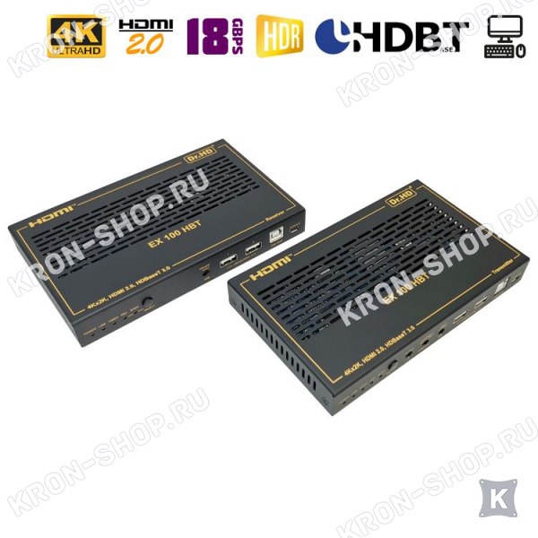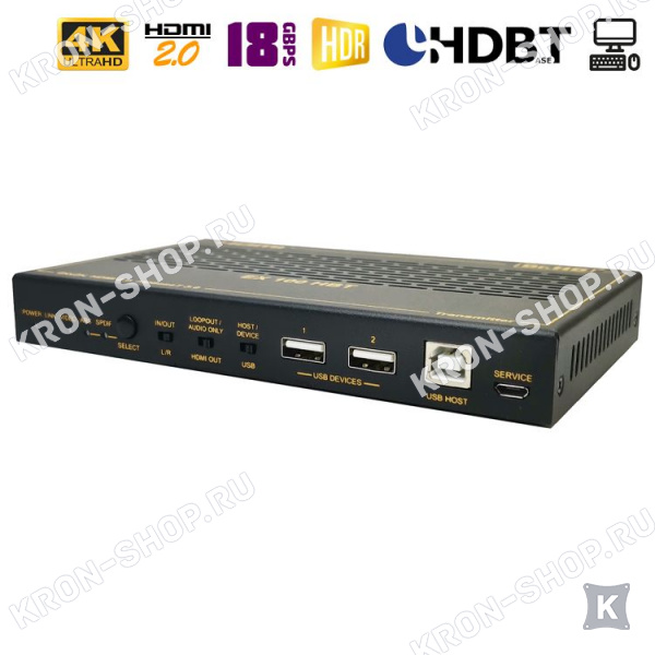 Многофункциональное устройство, которое совмещает в себе аудио- и видео- удлинитель и устройство для удаленного управления ПК, так называемое KVM. Продвинутые спецификации: HDMI 2.0b, HDCP 2.2, 4K 60Hz, 18Gbps, HDR, HDR10, HDR10+, Dolby Vision, HLG и пр. Расстояние передачи до 100 метров по витой паре. Присутствует обратный аудиоканал eARC/ARC и двунаправленное ИК управление. Запитывается удлинитель лишь с одной стороны. Имеется поддержка технологии HDBaseT 3.0 и сквозная передача управления по RS-232.
