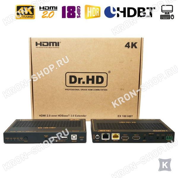 HDMI удлинитель по витой паре Dr.HD EX 100 HBT предназначен для передачи цифрового аудио- видео- сигнала ультравысокой четкости Ultra HD (4K) на расстояние до 100 метров, используя в качестве среды передачи кабель витая пара. Благодаря поддержке технологии HDBaseT 3.0, обеспечивается передача несжатого потока без каких-либо потерь качества. Вместе с аудио- видео- потоком передается управление по интерфейсу USB 2.0, порту RS-232 и двунаправленное ИК управление. Имеется поддержка видео разрешений 4Kx2K с частотой до 60Hz (YUV444), стандарта HDMI 2.0b и протокола защиты HDCP 2.2. Пропускная способность – до 18Gbps.