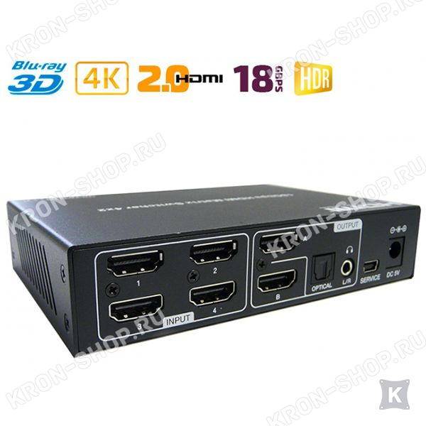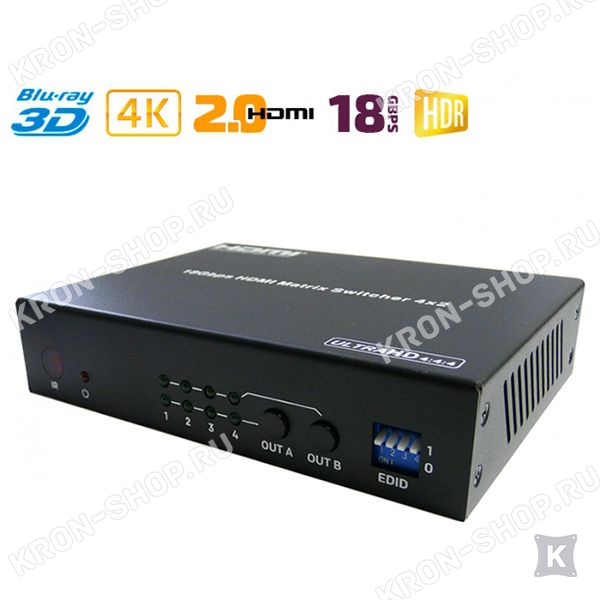 Матричный коммутатор 4 на 2 Dr.HD с поддержкой HDMI 2.0b. Эта матрица собрала в себе все, что только можно себе представить: HDMI 2.0b, 18Gbps, HDCP 2.2, 4Kx2K (4:4:4) с частотой до 60Hz, HDR, 3D, LPCM 7.1CH, Dolby TrueHD и DTS-HD Master Audio. Имеется умный EDID переключатель,а так же выходные аудио интерфейсы SPDIF и 3.5mm Jack. Эта небольшая коробочка обладает огромным функционалом, и отлично подойдет как для домашнего, так и для профессионального применения. С её помощью сигнал 4х любых HDMI источников можно разделить на 2 устройства воспроизведения (мониторы, телевизоры, проекторы и т.п.), и без потери качества сигнала наслаждаться высочайшим качеством изображения и звука.