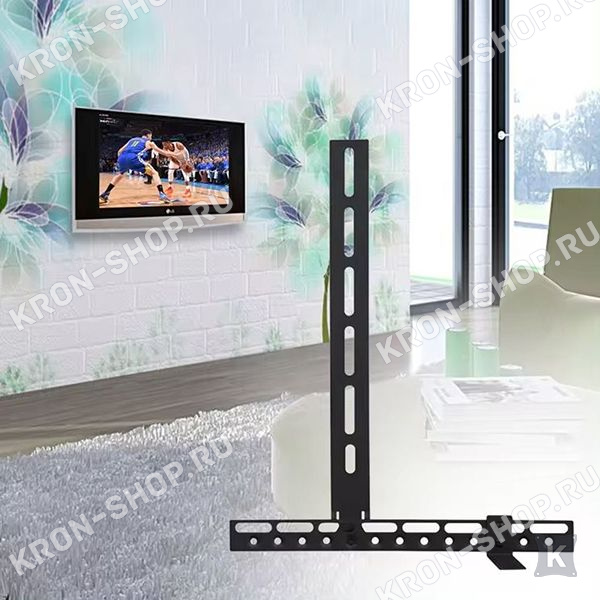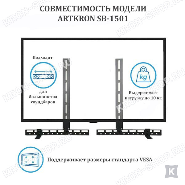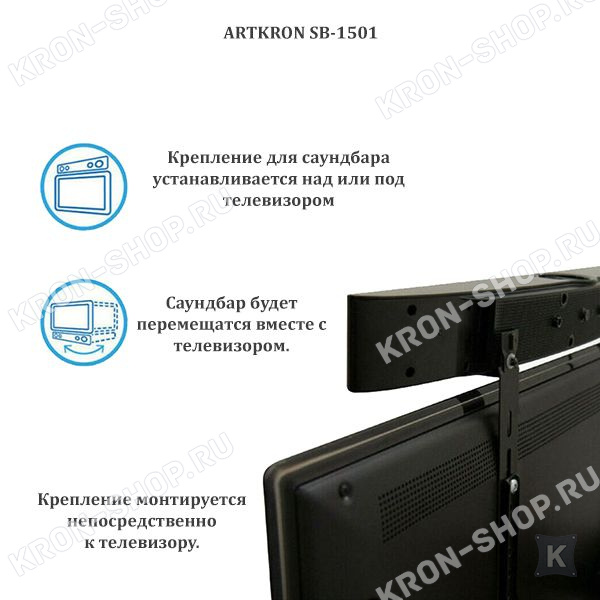 Крепление для саундбара ARTKRON SB-1501 крепится к кронштейну телевизора и не требует лишних отверстий в стене. Такой способ монтажа актуален при использовании подвижных телевизионных кронштейнов с функциями наклона, поворота и изменении высоты. При позиционировании телевизора в пространстве саундбар перемещается вместе с телевизором. Таким образом сохраняется направленность звука от саундбара относительно экрана и ощущение присутствия.