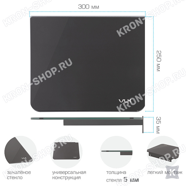 Полка выполнена из закалённого стекла и имеет закруглённые края.