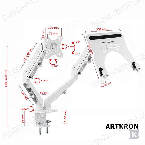 Кронштейн позволяет легко и плавно изменять высоту ноутбуков за счёт газового амортизатора. поворачивать а ±90°и выставить удобный угол наклона.