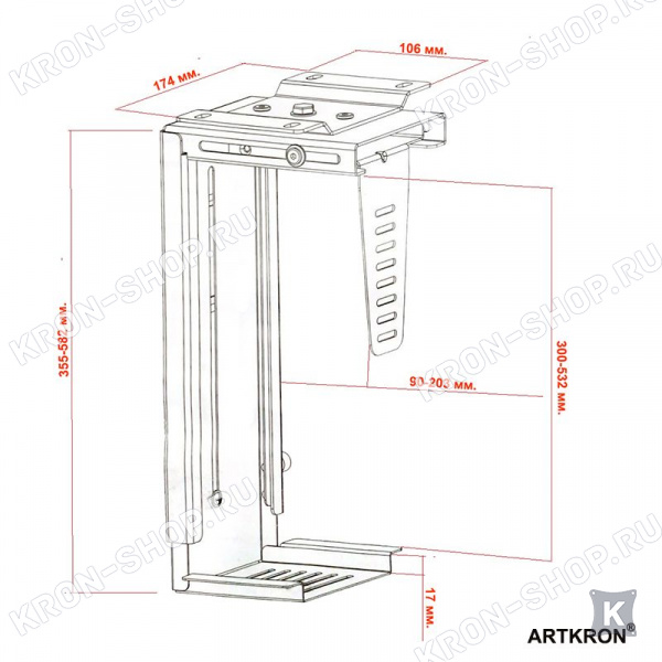 Универсальное крепление ARTKRON CPB-01 подходит для системных блоков различных размеров. Доступна функция вращения на 90 градусов, регулировка по длине, глубине и высоте.