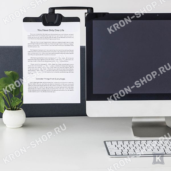 Закрепив держатель к верхней части монитора на двухсторонний скотч, вы сможете читать документы и Ваши заметки не опуская глаз.
