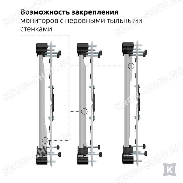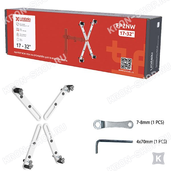 C помощью переходника Uniteki FP2NW можно установить монитор с диагональю до 32", в корпусе которого нет монтажных отверстий для крепления, на кронштейн стандарта VESA 75x75 и 100x100 мм. Все необходимые винты включены в комплект.
