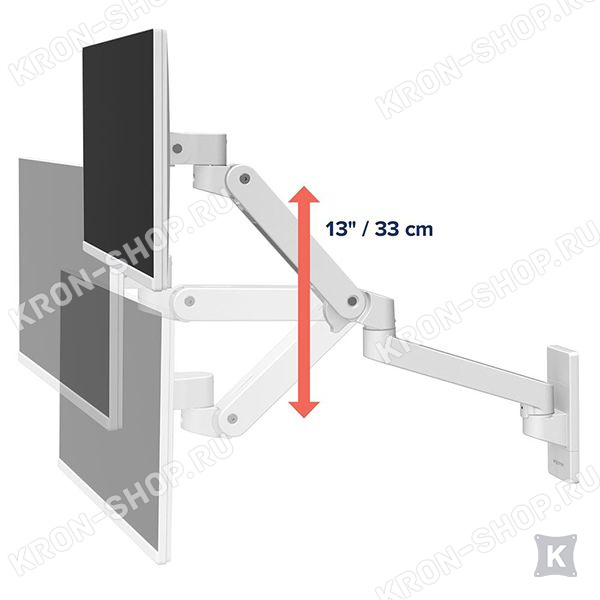 Настенный поворотно-наклонный кронштейн в белом цвете c регулировкой по высоте для монитора с диагональю до 34 дюймов включительно.