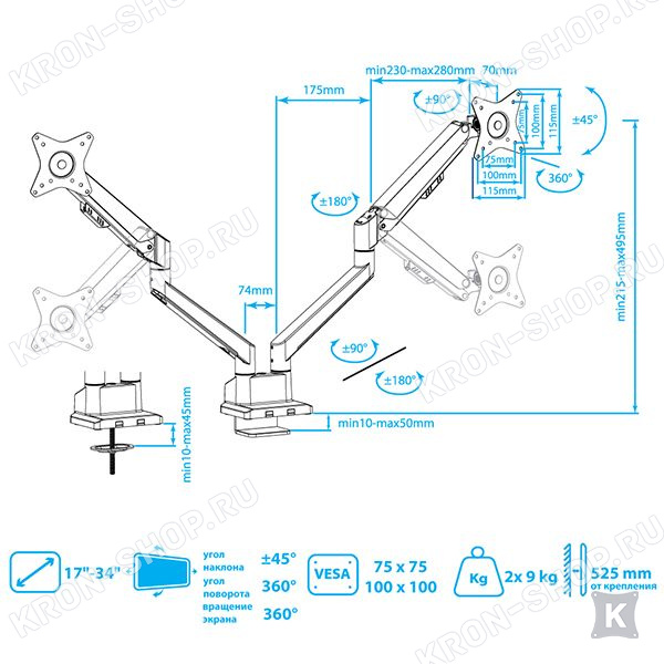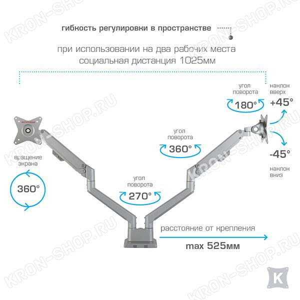 Настольный панорамный поворотно-наклонный кронштейн для двух мониторов с диагональю до 34 дюймов включительно c возможностью регулировки по высоте.