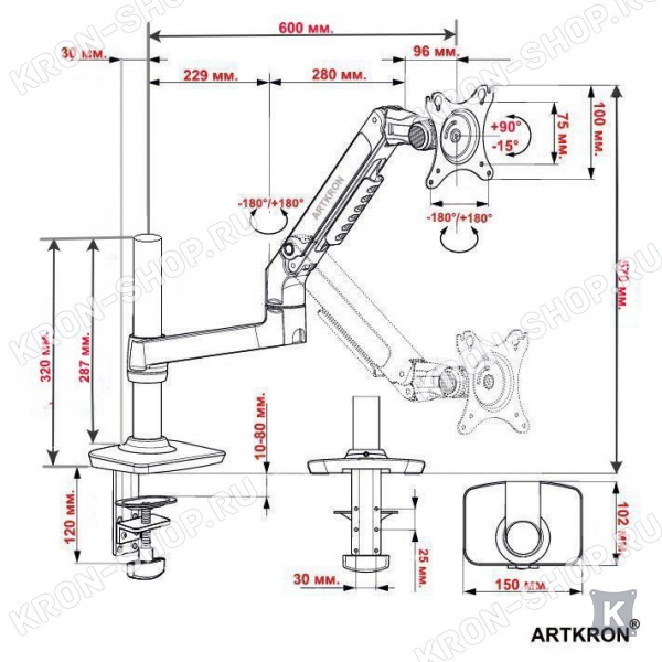 Крепление для монитора ARTKRON ART-K1-320U рассчитано для мониторов со стандартом 75х75, 100х100 мм., весом от 3 до 13 кг. радиусом изгиба монитора от 4000R до 1800R. Кронштейн ART-K1-320U поможет вам организовать рабочее место за счёт возможности придания монитору множества степеней свободы.