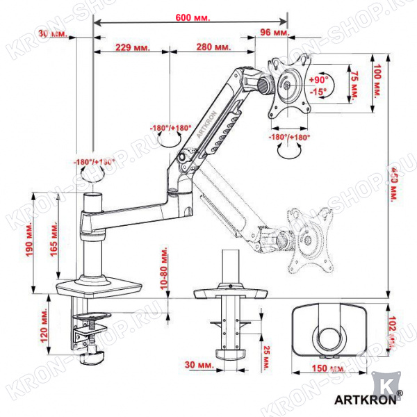Крепление для монитора ARTKRON ART-K1 рассчитан для мониторов со стандартом 75х75, 100х100 мм., весом от 3 до 10 кг. радиусом изгиба монитора от 4000R до 1800R. Кронштейн ART-K1 поможет вам организовать рабочее место за счёт возможности придания монитору множества степеней свободы.