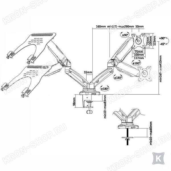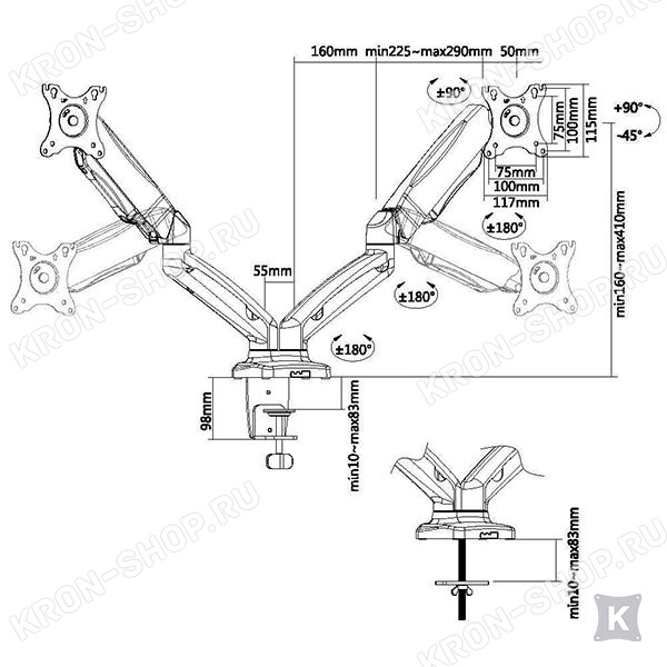 Кронштейн ARTKRON Shelf-705 позволяет легко и плавно изменять ориентацию монитора вертикально / горизонтально за счёт газового амортизатора. Нагрузка на один монитор от 2 до 6,5 кг. Монитор дополнительно можно наклонять -45° (вниз) / +90° (вверх), поворачивать на ±90° и вращать на 360°.