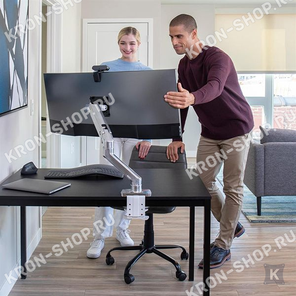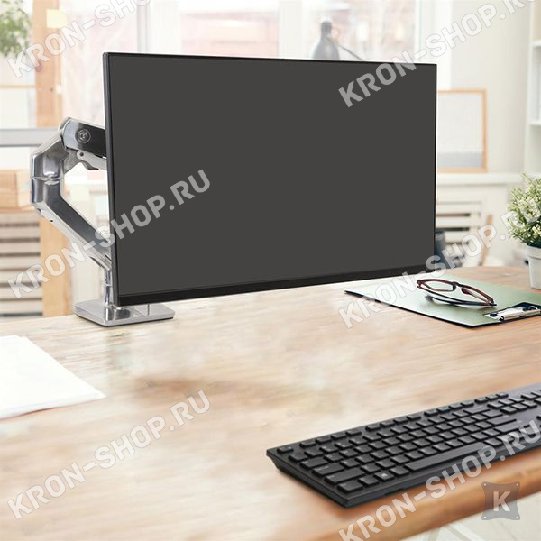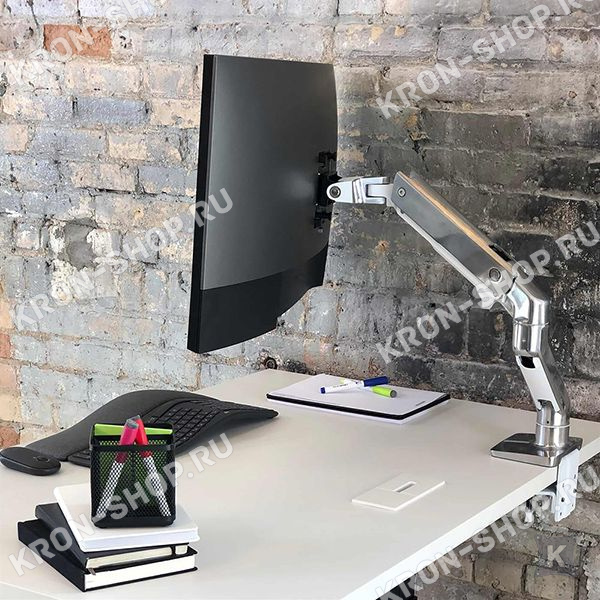За счёт подъема монитора вверх, а также отвода соединительных кабелей в специальный канал, значительная часть рабочего стола освобождается. Вы можете "сложить" звенья крепления, придвинув его практически вплотную к стене.