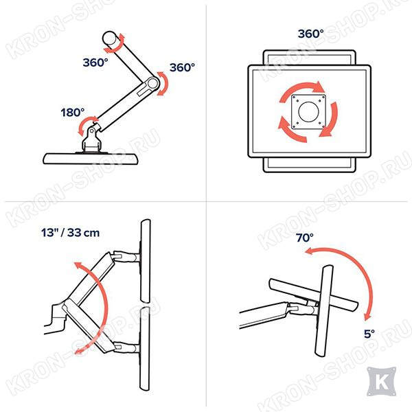 Запатентованная технология Constant Force (CF) позволяет изменять положение монитора минимальным усилием руки. Звенья крепления Ergotron LX Dual Stacking Arm (45-492-224) складываются и придвигаются практически вплотную к стене. Защелкивающаяся крышка-фиксатор кронштейна Ergotron LX Dual Stacking Arm (45-492-224) предохраняет от случайного снятия. Зажим-струбцина гарантируют ещё большую надёжность и стабильность при монтаже на поверхность. Специальные клипсы помогают поддерживать провода в кабельном канале, а значит на вашем рабочем месте будет порядок.