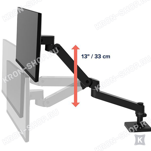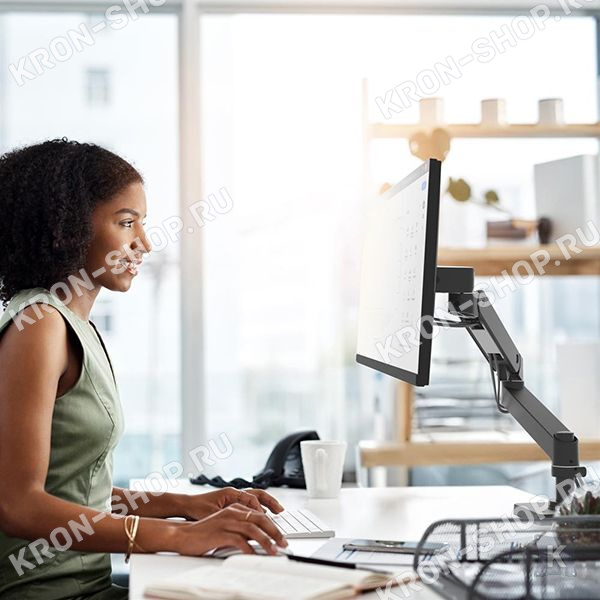 За счёт подъема монитора вверх, а также отвода соединительных кабелей в специальный канал, значительная часть рабочего стола освобождается. Вы можете "сложить" звенья крепления, придвинув его практически вплотную к стене.