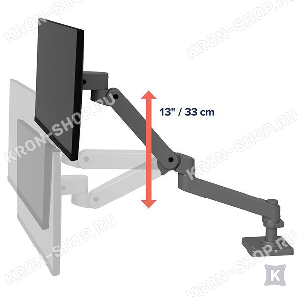 За счёт подъема монитора вверх, а также отвода соединительных кабелей в специальный канал, значительная часть рабочего стола освобождается. Вы можете "сложить" звенья крепления, придвинув его практически вплотную к стене.