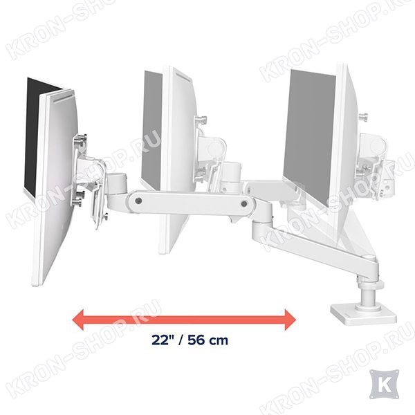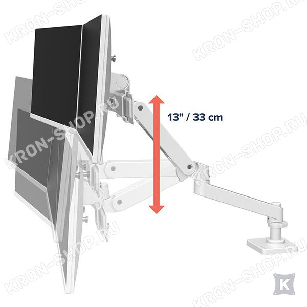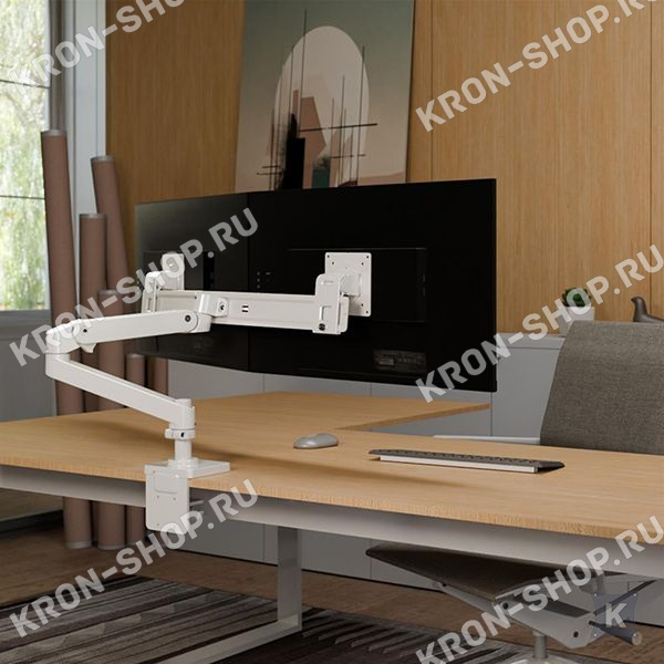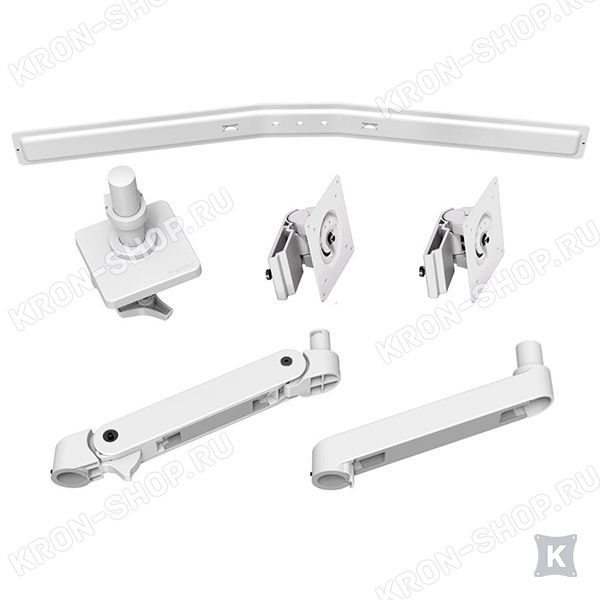 Настольный панорамный поворотно-наклонный кронштейн в белом цвете для двух мониторов с диагональю до 27 дюймов включительно c возможностью регулировки по высоте.