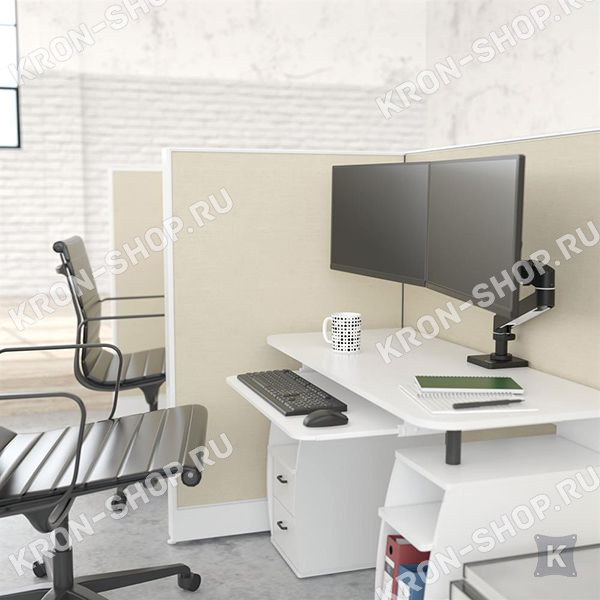 Настольный панорамный поворотно-наклонный кронштейн в чёрном цвете для двух мониторов с диагональю до 27 дюймов включительно c возможностью регулировки по высоте.