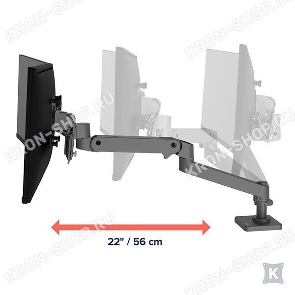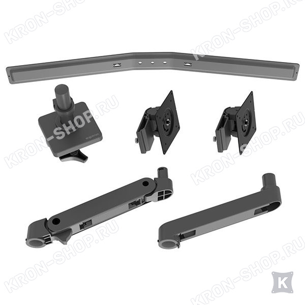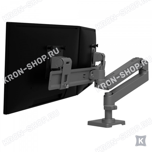 Настольный панорамный поворотно-наклонный кронштейн в тёмно-сером цвете для двух мониторов с диагональю до 27 дюймов включительно c возможностью регулировки по высоте.
