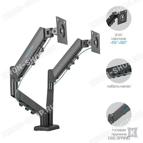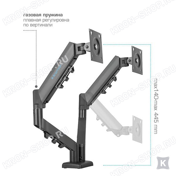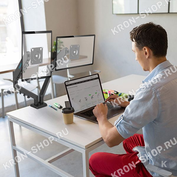Крепление для двух мониторов Kromax Office-14 поможет вам организовать рабочее место за счёт возможности придания монитору множества степеней свободы. Радиус изгиба монитора от 4000R до 1800R.