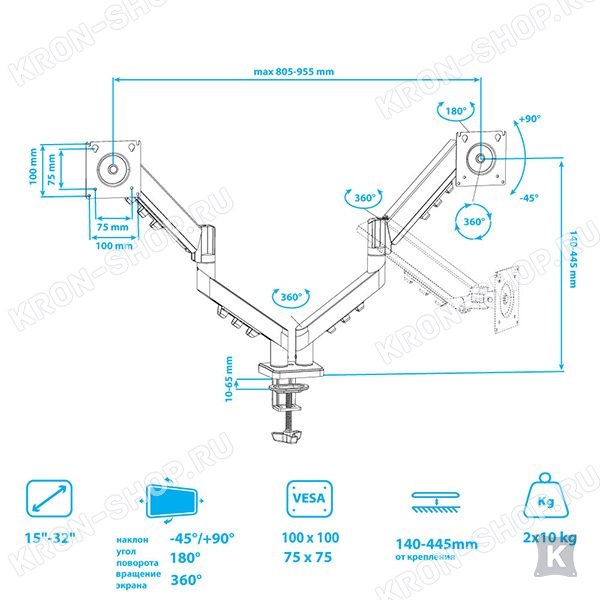 Настольный поворотно-наклонный кронштейн c регулировкой по высоте для двух мониторов с диагональю до 32 дюймов включительно.