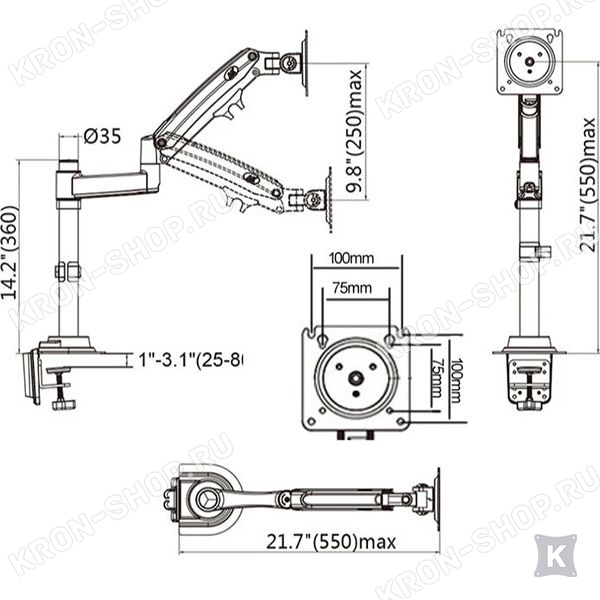 Настольный поворотно-наклонный кронштейн c регулировкой по высоте для монитора с диагональю до 34 дюймов включительно.