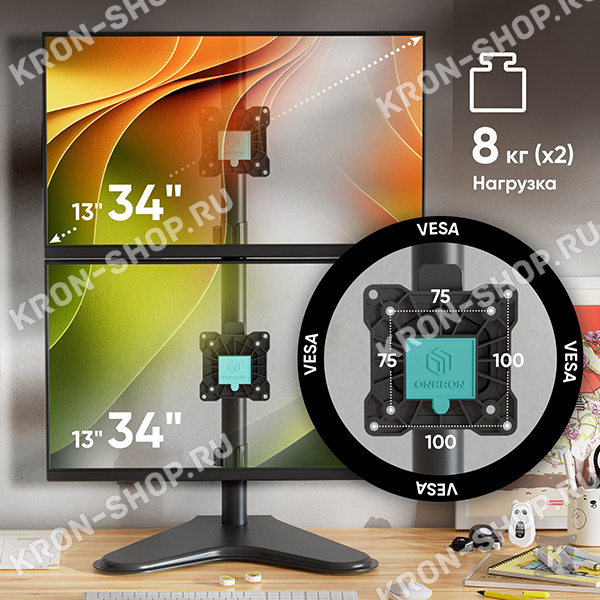 угол наклона экрана от -45° до +45°; угол поворота основания до 360°; крепление стандарта VESA: 75x75, 100x100 мм; суммарная максимальная нагрузка до 16 кг (по 8 кг на каждый монитор); портретная или ландшафтная ориентация экрана; регулировка по высоте в диапазоне до 905 мм; вылет от основания от 0 до 88 мм.Особенности кронштейна Onkron D208FS: