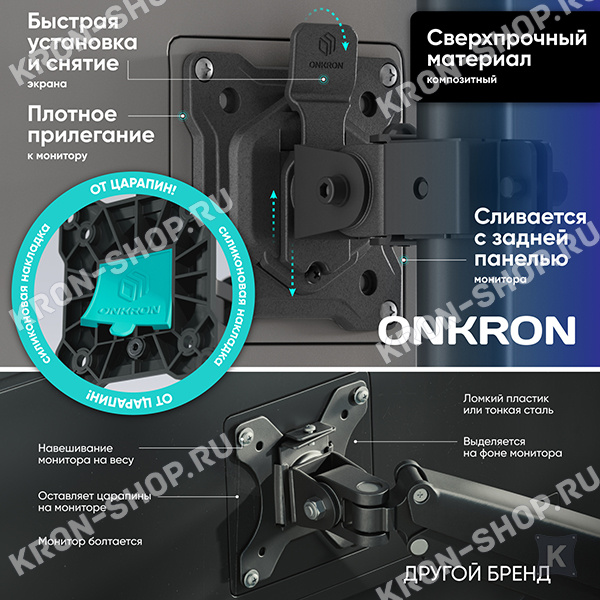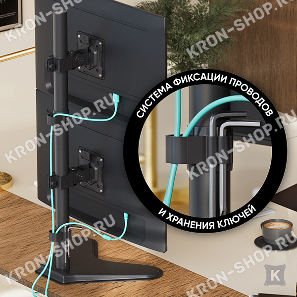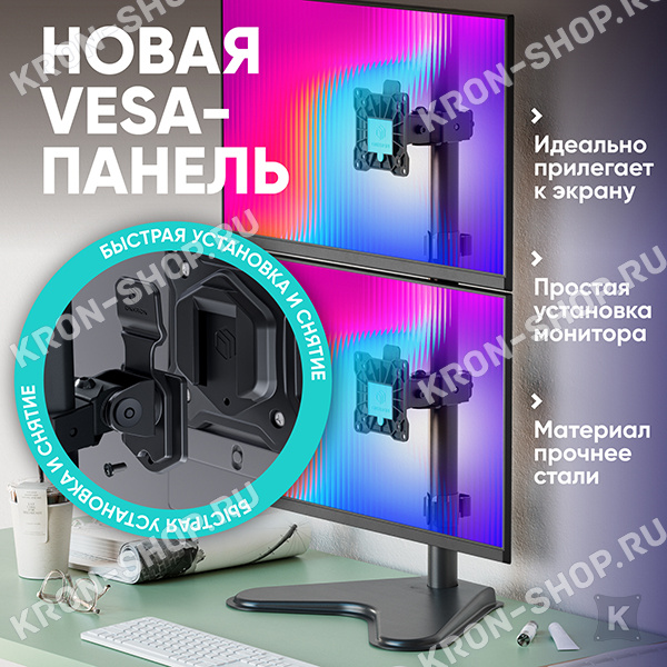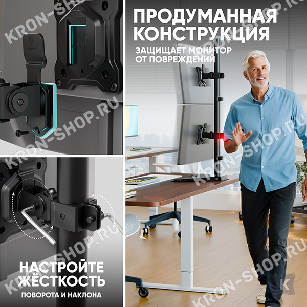 возможность перенести в любое место, благодаря струбцине, не оставляющей следов на поверхности; холоднокатанная сталь (SPCC), применяемая при производстве, позволяет надёжно фиксировать любые телевизоры или мониторы весом не более 8 кг каждый; пластиковые фиксаторы на частях корпуса позволят закрепить все провода.Похожие товары