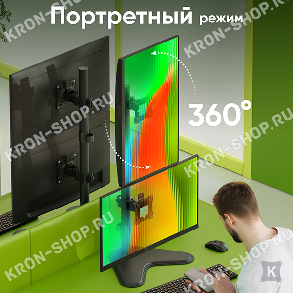 Настольный поворотно-наклонный кронштейн для двух мониторов с диагональю до 32 дюймов, установленных вертикально друг над другом.