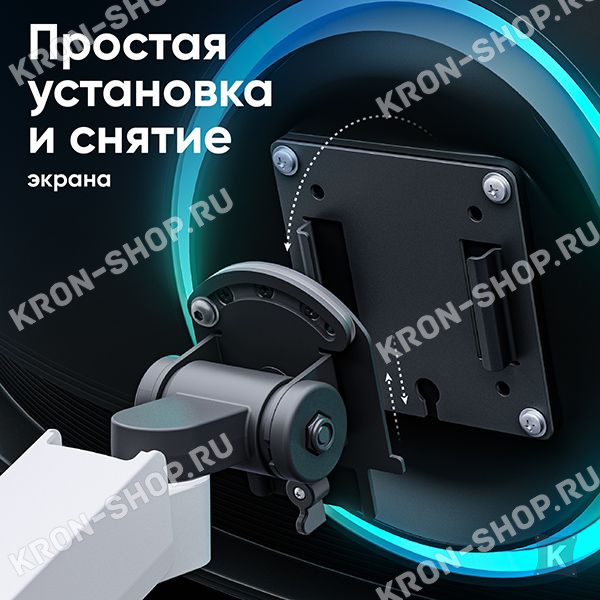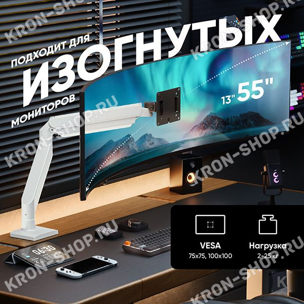 Кронштейн Onkron G110-BW не оставит никого равнодушным, не только потому, что подходит для всех мониторов и телевизоров, диагональю от 15" до 55" и весом от 2 кг до 25 кг (изогнутый монитор от 2 до 20 кг), что позволяет легко и просто передвигать монитор в любых плоскостях, и даже менять его положение по вертикали! Всё это благодаря газовой пружине, располагающейся внутри корпуса кронштейна, именно она может зафиксировать монитор в любом положении и менять его не прилагая существенных усилий. Поворачивайте монитор вокруг своей оси на 360°, наклоняйте вверх и вниз, придвигайте или удаляйте от себя, поднимите монитор повыше или опустите пониже – всё это может наш кронштейн Onkron G110-BW.
