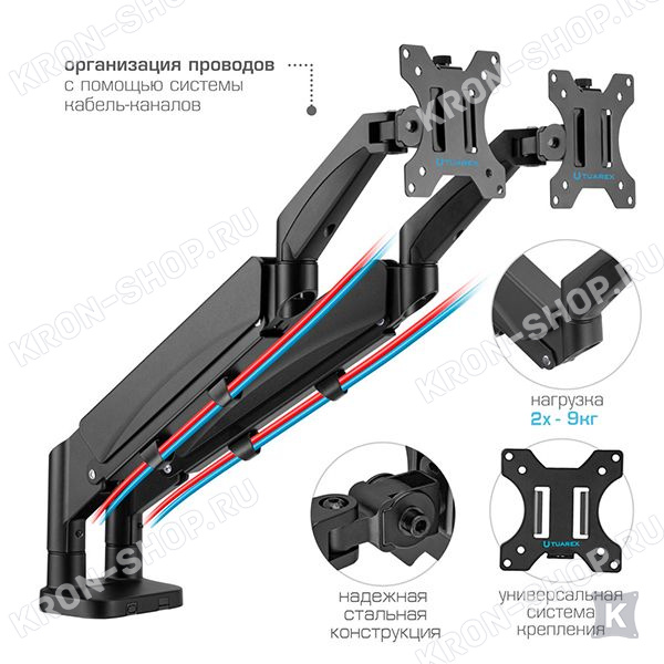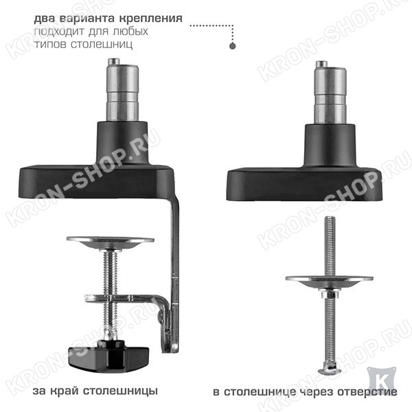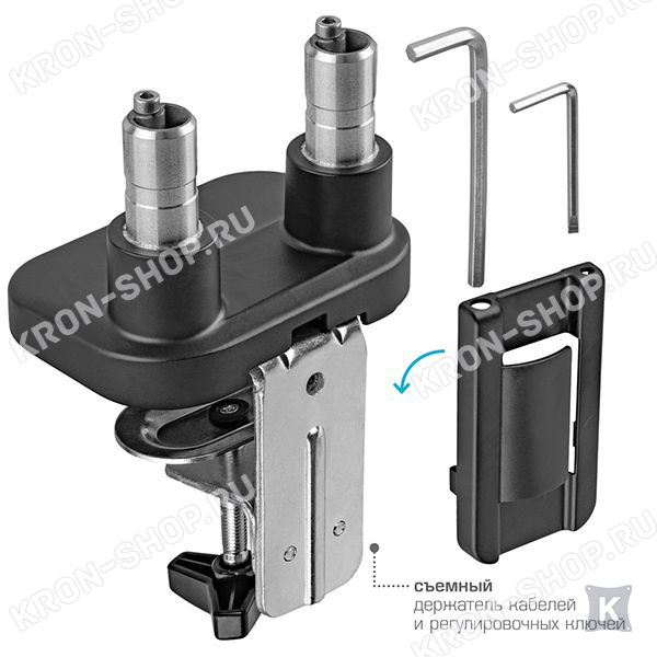 В конструкции кронштейна Tuarex Alta-15 предусмотрены скрытые каналы для укладки всех соединительных проводов. Два варианта крепления к столу: зажим к краю стола и крепление на поверхность стола.
