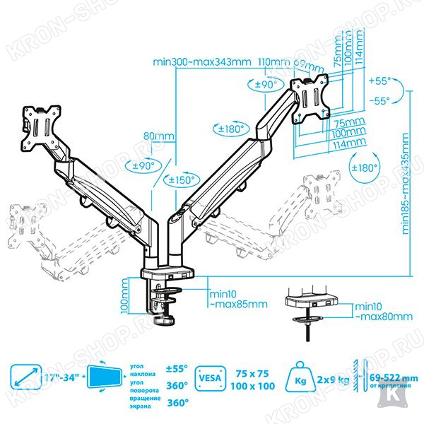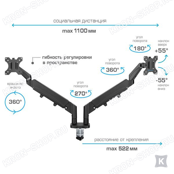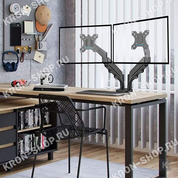 Настольный наклонно-поворотный кронштейн с регулировкой высоты для двух мониторов с диагональю до 34 дюймов.