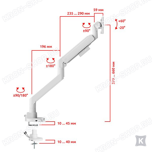 Плавное и лёгкое движение кронштейна влево и вправо, вперёд и назад, вверх и вниз, а также фиксация в любом промежуточном положении;