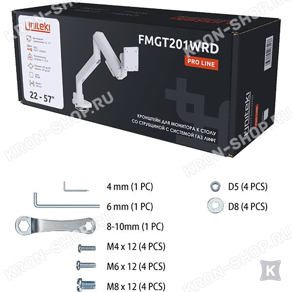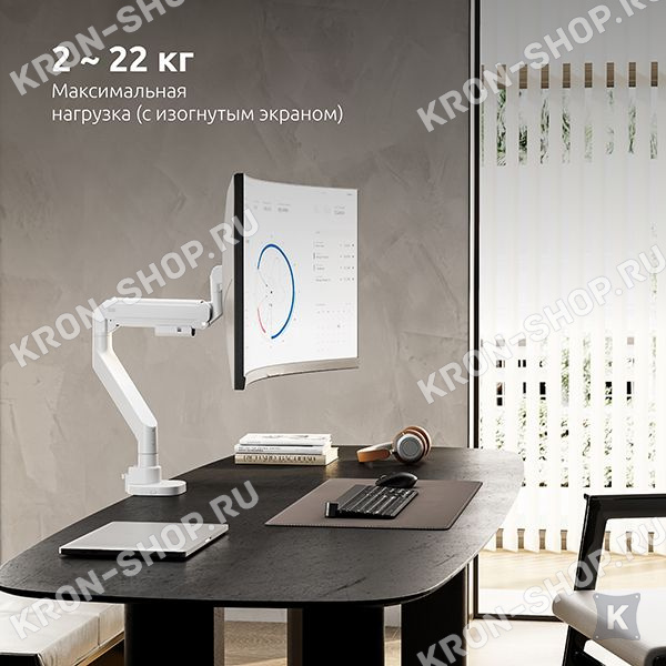 Кронштейн FMGT201WRD не оставит никого равнодушным, не только потому, что подходит для всех мониторов и телевизоров, диагональю от 22" до 57" и весом от 2 до 27 кг (допустимая нагрузка для изогнутого экрана от 2 до 22 кг) и позволяет легко и просто передвигать монитор в любых плоскостях, и даже менять его положение по вертикали! Всё это благодаря газовой пружине, располагающейся внутри корпуса кронштейна, именно она может зафиксировать монитор в любом положении и менять его не прилагая существенных усилий. Поворачивайте монитор вокруг своей оси на 360°, наклоняйте вверх и вниз, придвигайте или удаляйте от себя, поднимите монитор повыше или опустите пониже – всё это может наш кронштейн FMGT201WRD.