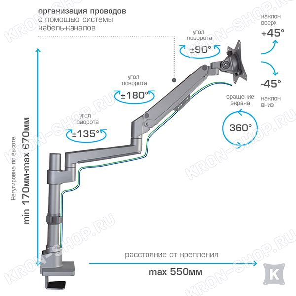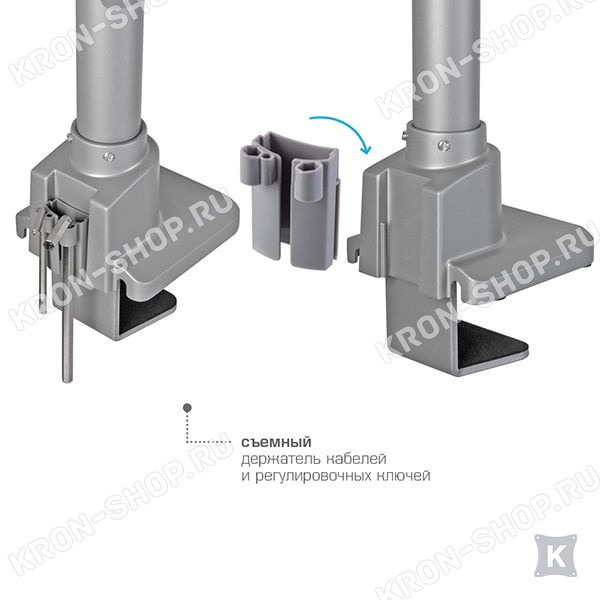 В конструкции кронштейна VLK Trento-94 предусмотрены скрытые каналы для укладки всех соединительных проводов. Два варианта крепления к столу: зажим к краю стола и крепление на поверхность стола.