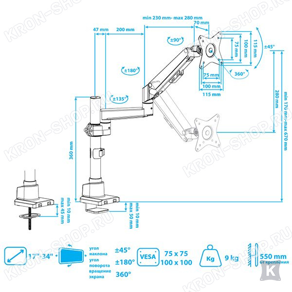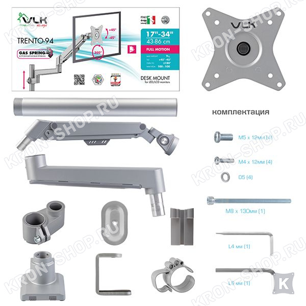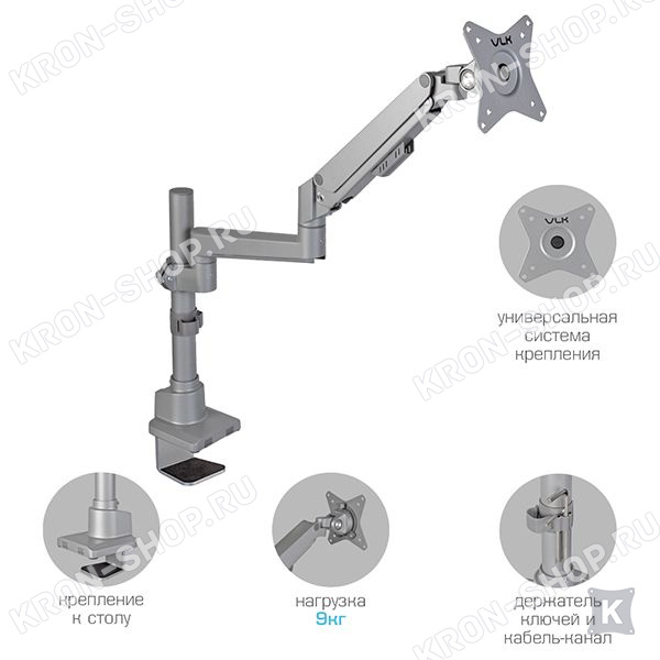 Настольный кронштейн VLK Trento-94 идеально подходит для всех мониторов с диагональю экрана от 17 до 34 дюймов (43-86 см) и весом от 2 до 9 кг. Кронштейн VLK Trento-94 позволяет легко и плавно изменять ориентацию монитора вертикально / горизонтально за счет газового амортизатора, который настраивается под вес любого монитора. Монитор дополнительно можно наклонять ±45°, поворачивать и вращать на 360°. Радиус изгиба монитора от 4000R до 1800R.