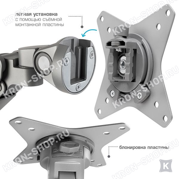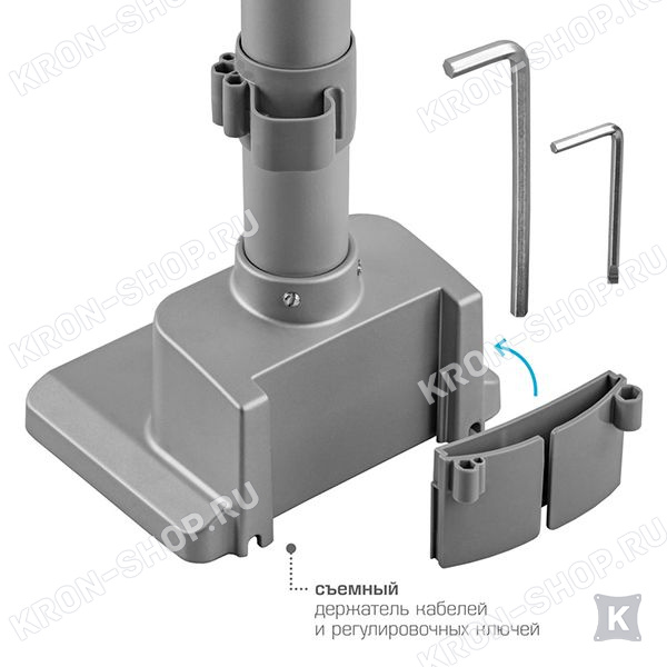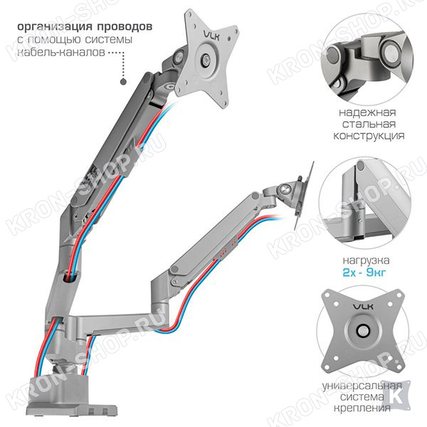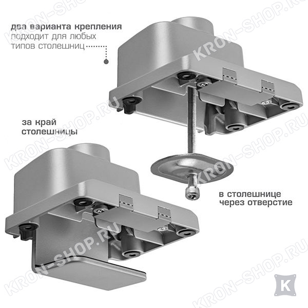 В конструкции кронштейна VLK Trento-95 предусмотрены скрытые каналы для укладки всех соединительных проводов. Два варианта крепления к столу: зажим к краю стола и крепление на поверхность стола.