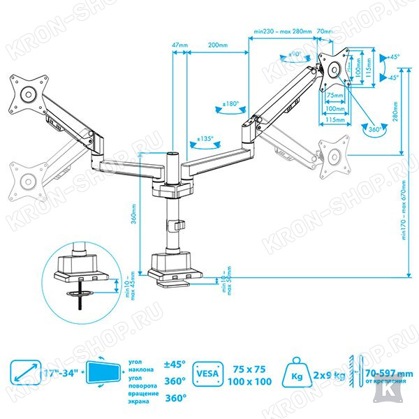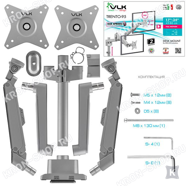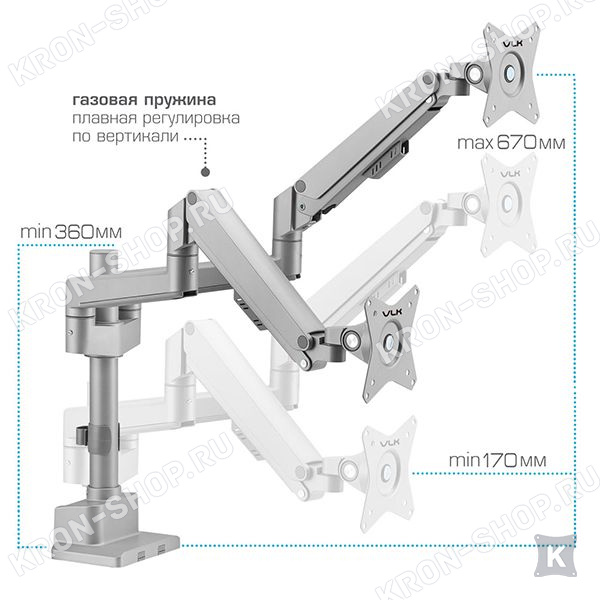 Настольный кронштейн VLK Trento-95 идеально подходит для всех мониторов с диагональю экрана от 17 до 34 дюймов (43-86 см) и весом от 2 до 9 кг. Кронштейн VLK Trento-95 позволяет легко и плавно изменять ориентацию монитора вертикально / горизонтально за счет газового амортизатора, который настраивается под вес любого монитора. Монитор дополнительно можно наклонять ±45°, поворачивать и вращать на 360°. Радиус изгиба монитора от 4000R до 1800R.