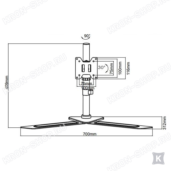 Предусмотрена возможность поворота до 90 градусов и наклона монитора на 30 градусов, предусмотрена возможность вращения на 360°. Опора позволяет регулировать высоту установки экрана до 409 мм над столом.