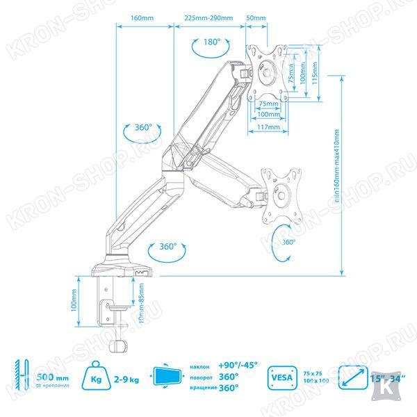 Настольный наклонно-поворотный кронштейн с регулировкой высоты для мониторов с диагональю до 34 дюймов.
