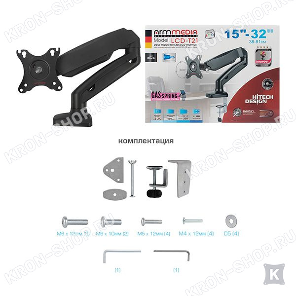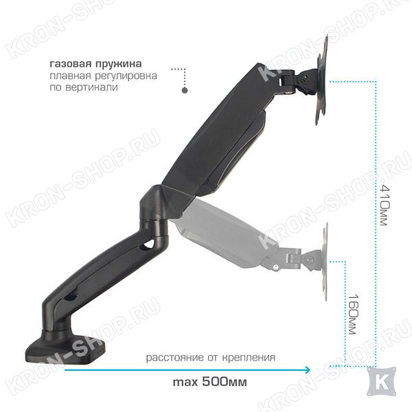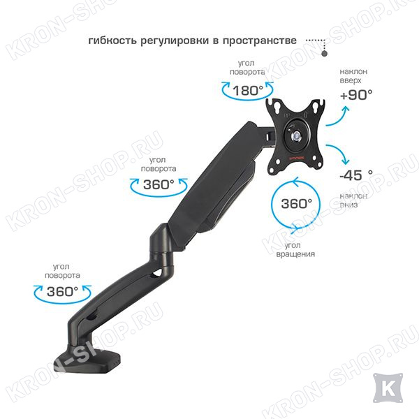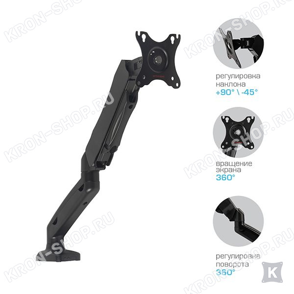 Кронштейн Arm-Media LCD-T21 позволяет легко и плавно изменять ориентацию монитора вертикально / горизонтально за счет газового амортизатора, который настраивается под вес любого монитора. Монитор дополнительно можно наклонять, поворачивать и вращать на 360°.