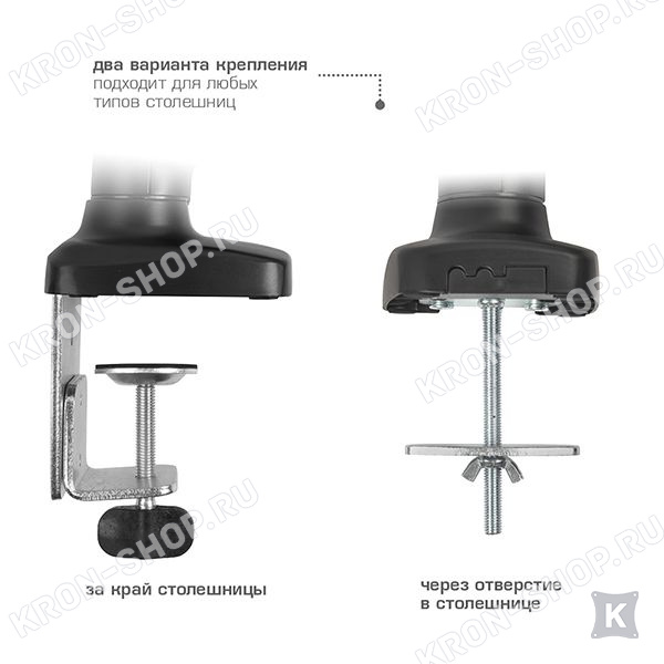 В конструкции кронштейна Arm-Media LCD-T21 предусмотрены скрытые каналы для укладки всех соединительных проводов. Два варианта крепления к столу: зажим к краю стола и крепление на поверхность стола.
