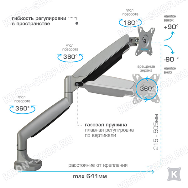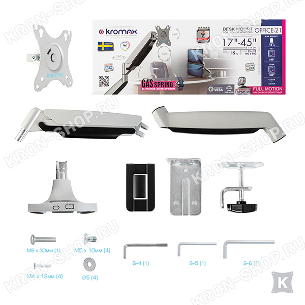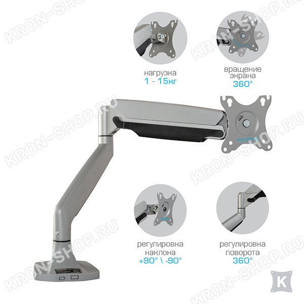 Настольный кронштейн Kromax Office-15 идеально подходит для всех мониторов с диагональю экрана от 15 до 34 дюймов (38-87 см) и весом от 2 до 10 кг. Кронштейн Kromax Office-15 позволяет легко и плавно изменять ориентацию монитора вертикально / горизонтально за счет газового амортизатора, который настраивается под вес любого монитора. Монитор дополнительно можно наклонять, поворачивать и вращать на 360°. Радиус изгиба монитора от 4000R до 1800R.
