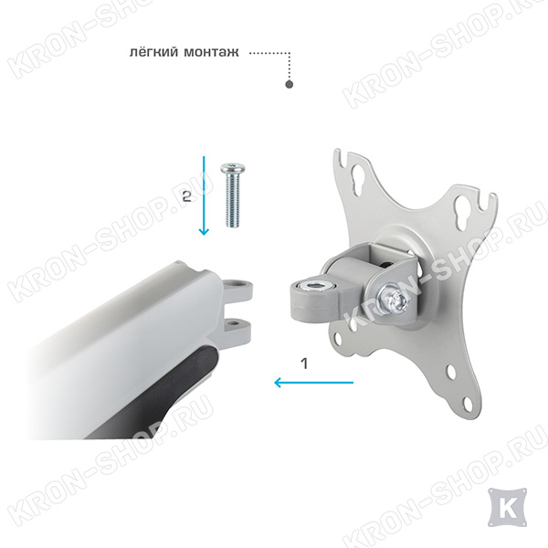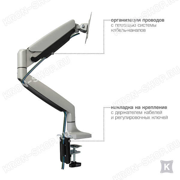 В конструкции кронштейна Kromax Office-15 предусмотрены скрытые каналы для укладки всех соединительных проводов. Два варианта крепления к столу: зажим к краю стола и крепление на поверхность стола.