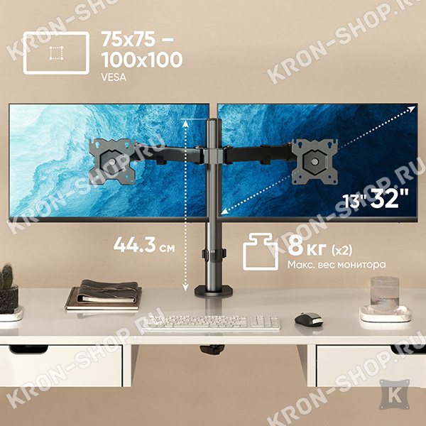 - суммарная максимальная нагрузка до 16 кг (по 8 кг на каждый монитор);