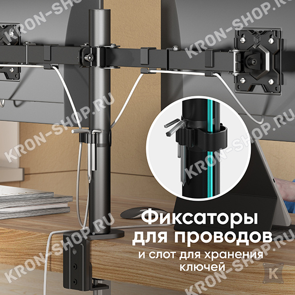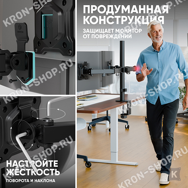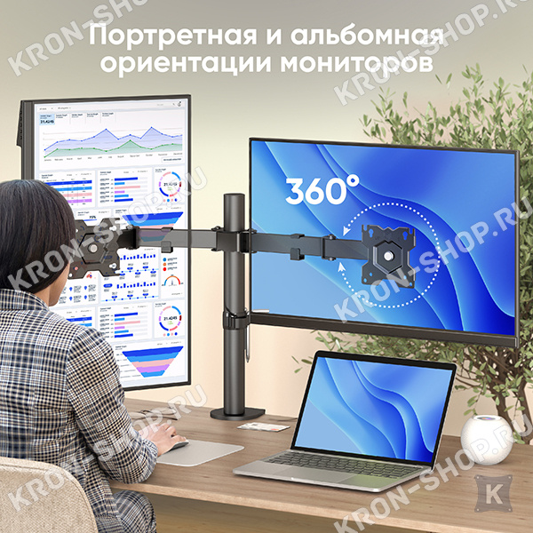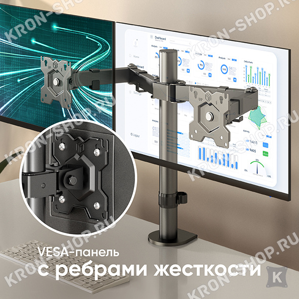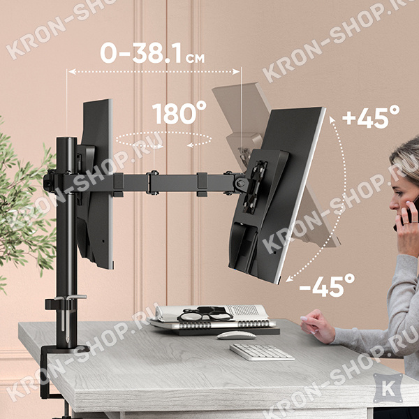 Настольный панорамный поворотно-наклонный кронштейн для двух мониторов с диагональю до 32 дюймов.