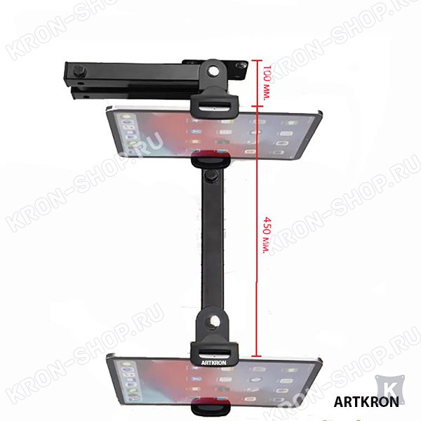 Горизонтальный вынос крепления ARTKRON Pad WTR-54 от 100 до 450 мм, угол наклона до 45 градусов, возможность поворота до 180 градусов и вращения планшета на 360 градусов. Возможность настройки различных углов обзора.