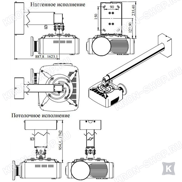 - вынос от потолка до проектора (потолочное крепление): 95,5-174 см;