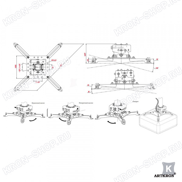 Универсальный потолочный кронштейн для проектора ARTKRON PRG10-B (230 мм, чёрный), состоящий из крепления, переходника и площадки к потолку для проектора. Обладает функциями наклона +/-20°, поворота +/-8° и вращения 360°. Выдерживает нагрузку до 35 кг. Максимальный размах крепёжных "лапок" – 450 мм. При необходимости сервисного обслуживания легко демонтируется с потолка. Поставляется в предварительно собранном виде и с отсортированными крепежами, что значительно облегчает инсталляцию. Прокладка кабеля внутри штанги обеспечивает всей инсталляции аккуратный внешний вид.