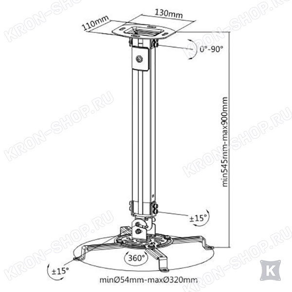 Универсальное потолочное крепление для проекторов весом до 15 кг c регулируемым расстоянием от потолка до проектора.