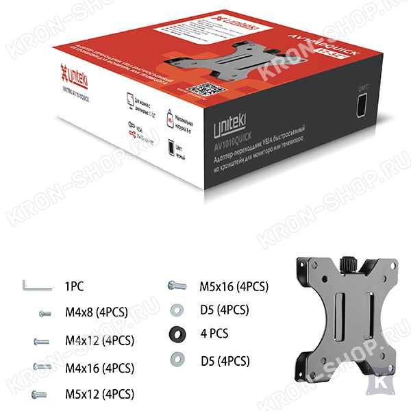 Быстросъемный адаптер Uniteki AV1010QUICK предназначен для установки мониторов или телевизоров с размерами монтажных отверстий 75х75, 100х100 на любой кронштейн с стандартом VESA, обладающей монтажными отверстиями 75х75 и 100х100 мм.